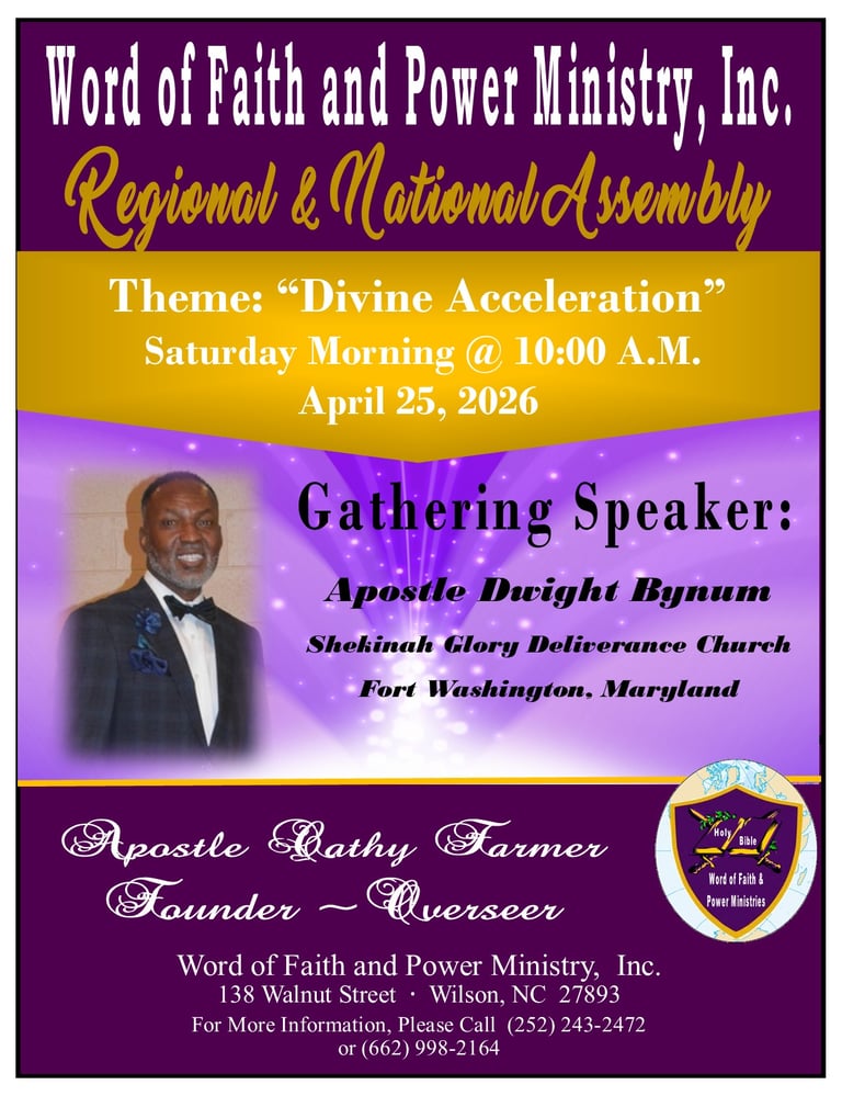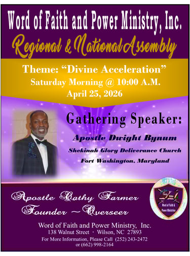 25th - (10:00am) Apostle Bynum preaching at Word of Faith & Power Int'l Ministries, 138 E Walnut St, Wilson, NC 27893
